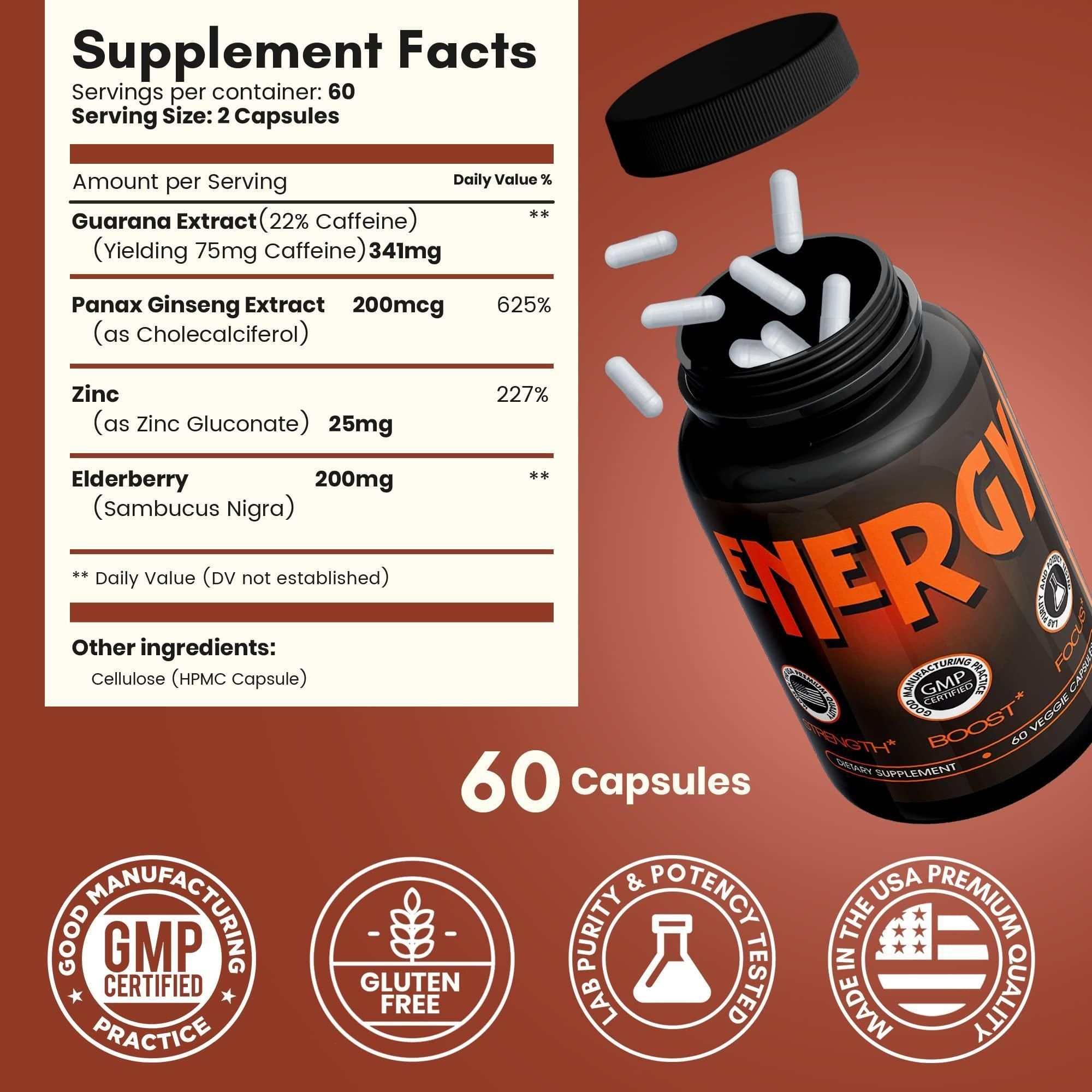 Caffeine Pills Alternative to an Energy Drink Energy Gel or Energy Gummies All Natural Energy Supplements Energy Pills with Elderberry 60 Capsules