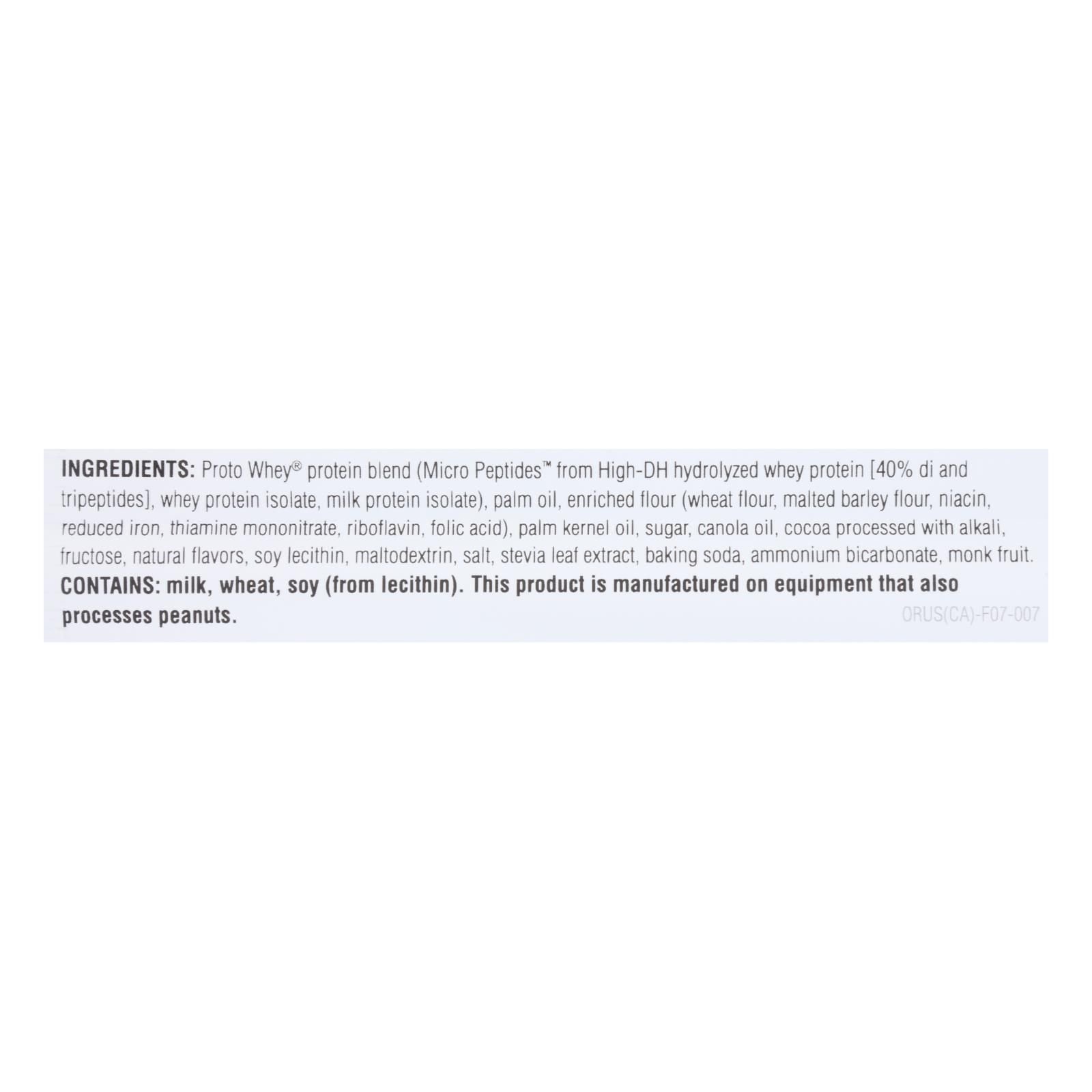 ingredients : proto whey protein blend (micro peptides from high-dh hydrolyzed whey protein, whey protein isolate, milk protein isolate);palm oil;enriched flour (wheat flour, malted barley flour, niacin, reduced iron, thiamine mononitrate, riboflavin, folic acid);palm kernel oil;sugar;canola oil;cocoa processed with alkali;fructose;natural flavors;soy lecithin;maltodextrin;salt;stevia leaf extract;baking soda;ammonium bicarbonate;monk fruit