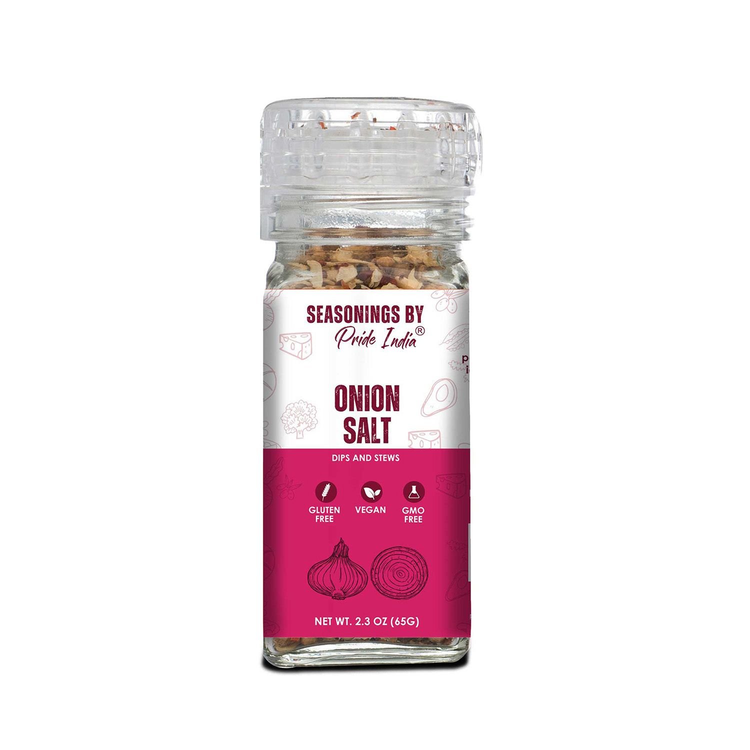 Pride of India Onion Salt 2.3 oz (65 gm) w/ Convenient Grinder Cap Healthy Warm Toasty Kitchen Staple | Used for Seasoning Marinades Coatings Dressing