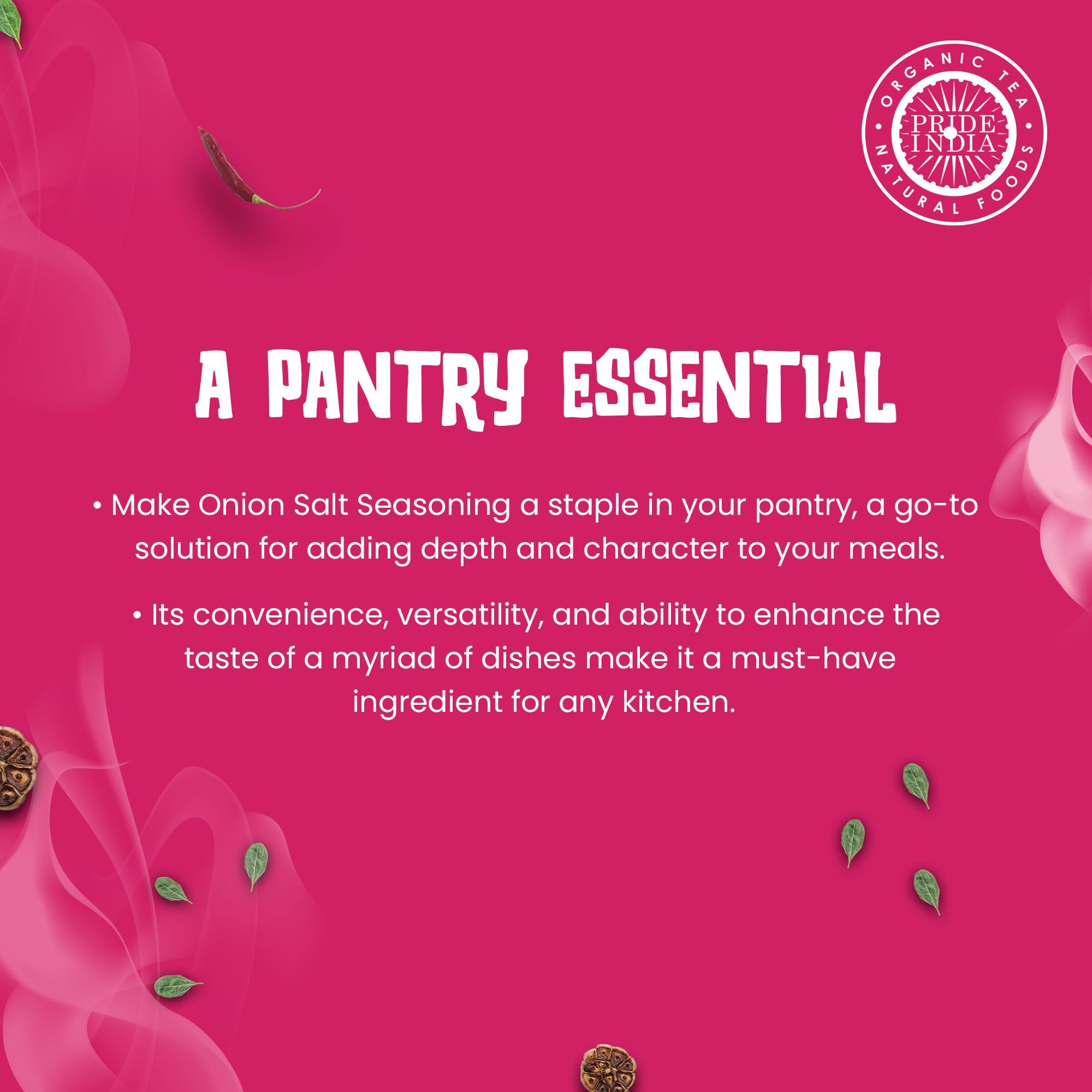 TANTALIZING PAIRINGS: Our Onion Salt is a versatile seasoning that pairs beautifully with a wide range of recipes, making it a kitchen essential. Its rich, savory flavor profile is a perfect match for many dishes. Use it to enhance the savory depth of soups, stews, and sauces, creating a warm and comforting base for your recipes. It also works wonders with grilled or roasted meats, adding a flavorful crust and a touch of toasty sweetness. For vegetarians and vegans, our Onion Salt elevates the taste of roasted or sautéed vegetables, turning them into a mouthwatering side dish. Moreover, it's fantastic in pasta dishes, giving them an extra layer of flavor that will keep your taste buds craving more. So, whether you're cooking up a hearty meal or experimenting with new recipes, our Onion Salt is the perfect companion to elevate your culinary creations.
