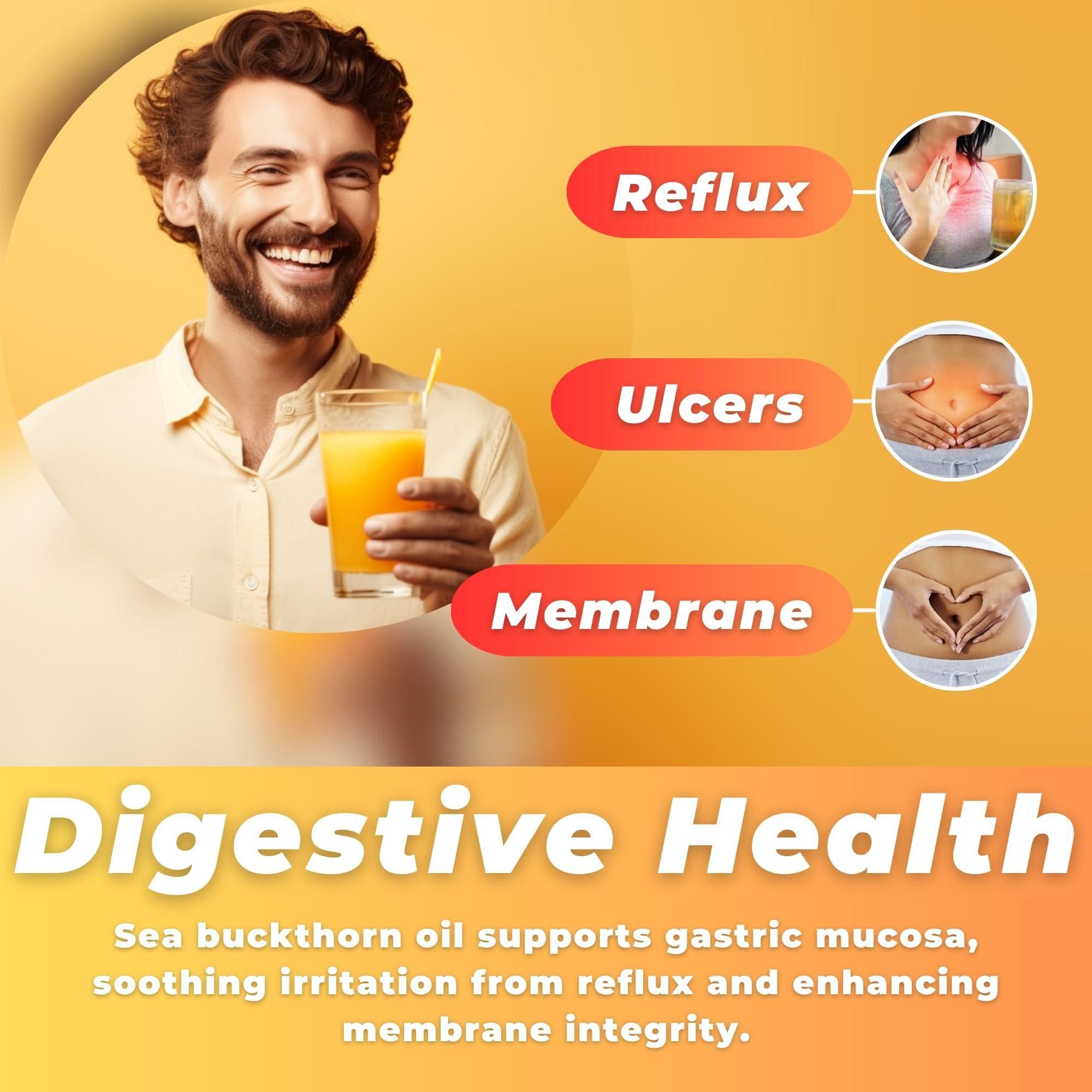 2.caution: our sea buckthorn berry oil organic is undeluted and has a natural yellow-orange color. digestive wellness: sea buckthorn oil supplement aids in fortifying gastric mucosa, soothing symptoms associated with reflux, and enhancing membrane integrity, which contributes to improved digestive health. immune function: with its high antioxidant content, seabuckthorn oil organic helps strengthen the immune system by protecting against oxidative stress and fighting off pathogens,