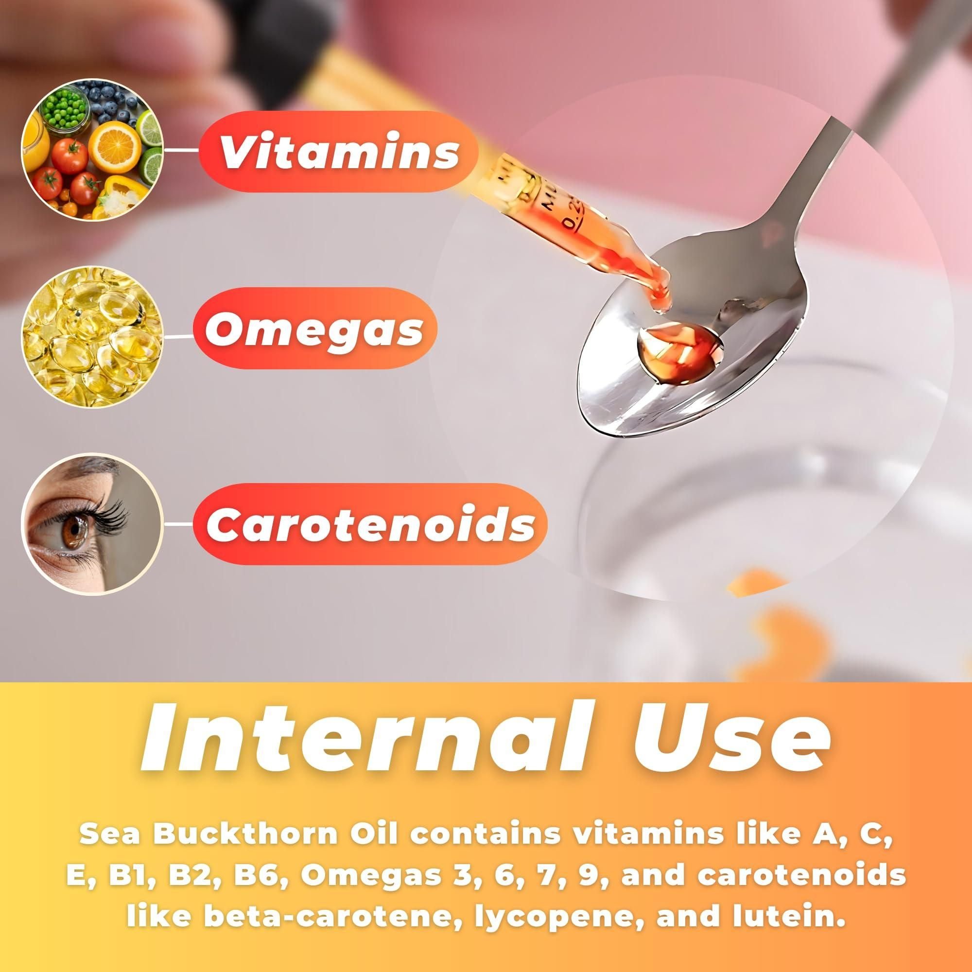 1.rich nutritional profile: seabuckthorn berry is packed with omega 3, 6, 7, and 9, vitamins a, c, e, and b, as well as essential amino acids and flavonoids, our sea buckthorn oil provides comprehensive nutritional support for overall well-being. skin health: ideal for incorporating into your skincare routine, this oil helps soothe skin irritation, enhances hydration, and supports the repair and resilience of your skin barrier,making it the perfect seabuckthorn oil for face and body.