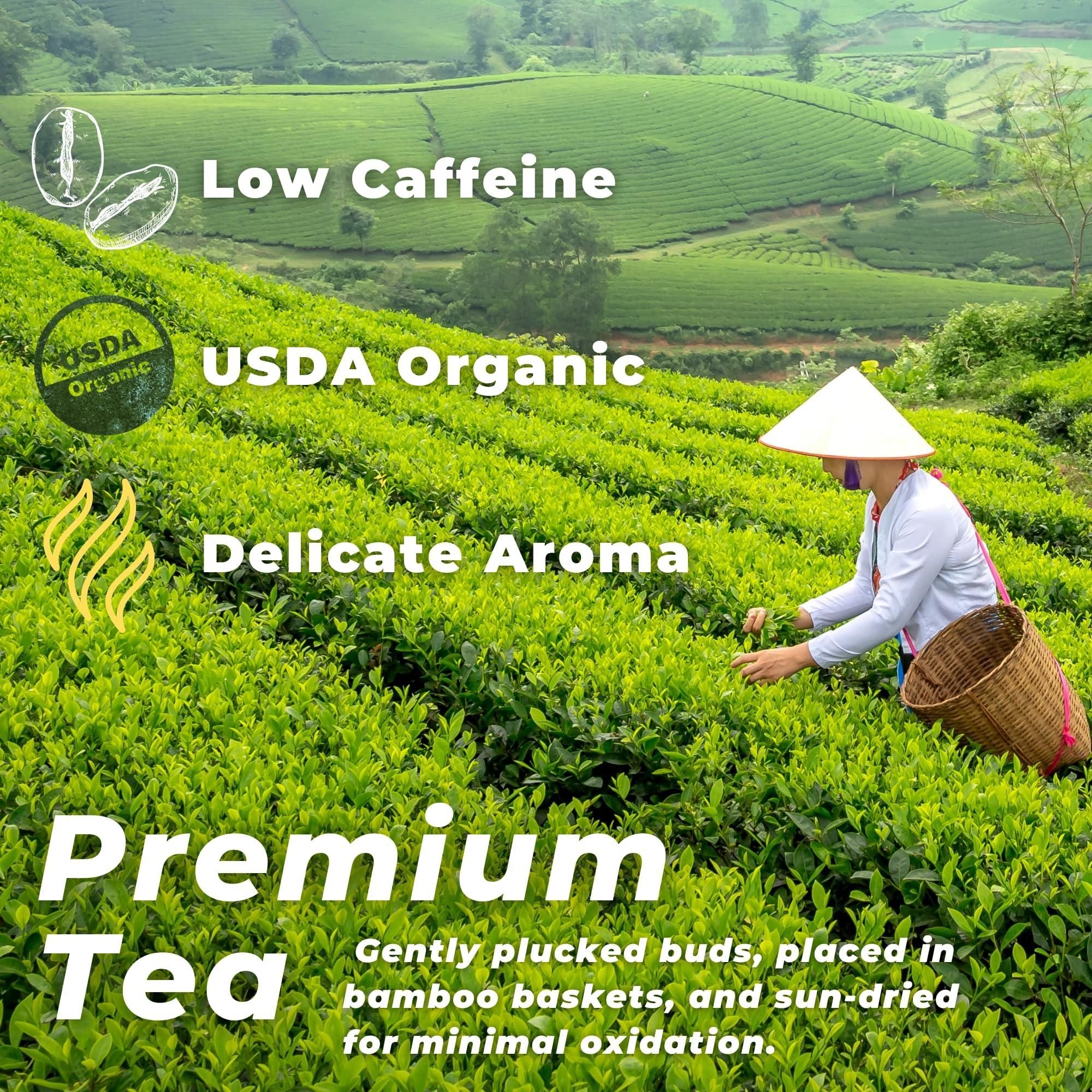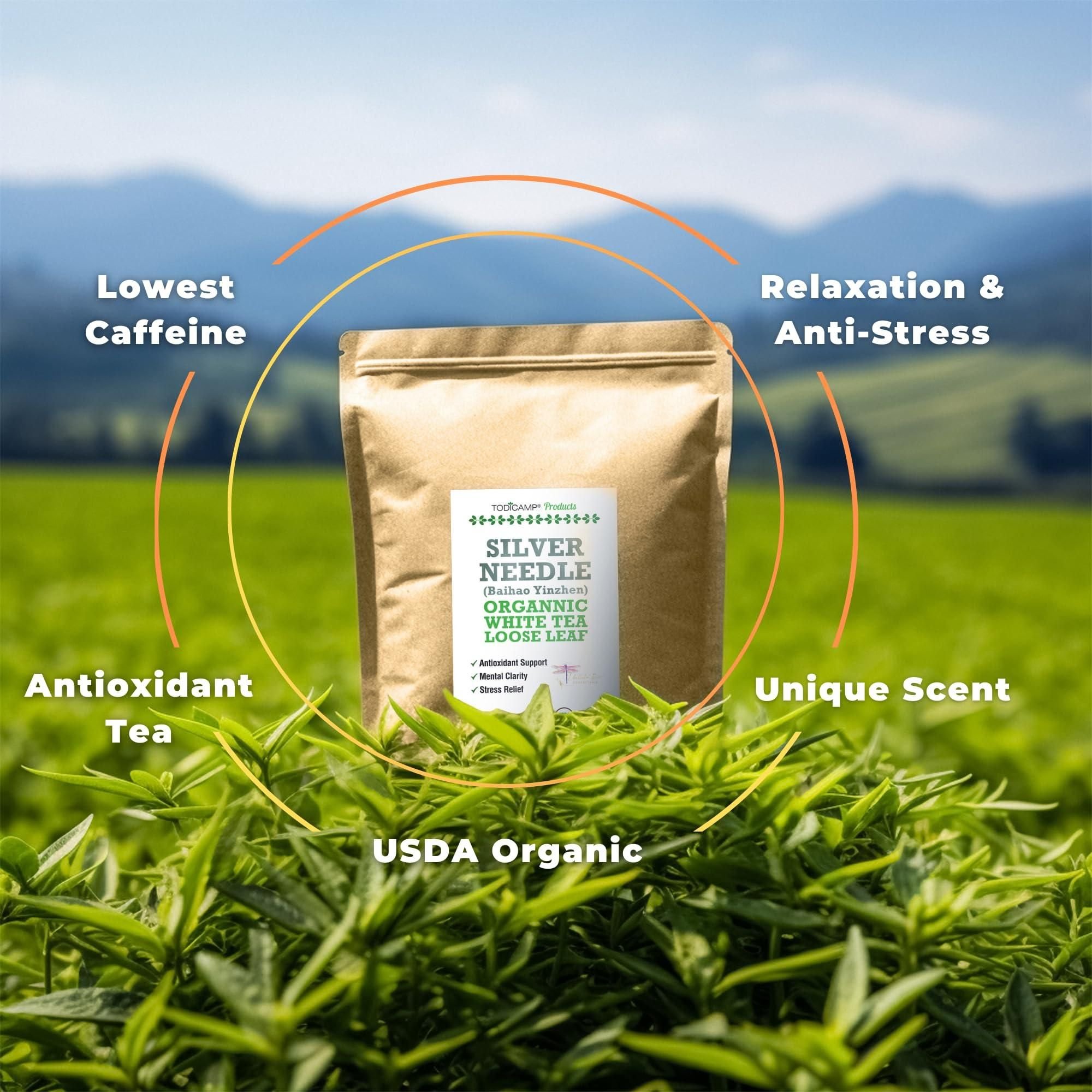 2.white tea loose leaf. an unforgettable everyday experience! high-grade white loose leaf tea: silver needle tea is considered the highest grade of loose white tea organic, made exclusively from the tender, unopened buds of the tea plant (camellia sinensis). lowest caffeine: the low caffeine levels, combined with the presence of l-theanine, an amino acid known for promoting relaxation and reducing stress, make silver needle white tea loose-leaf a soothing beverage that supports overall